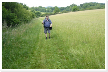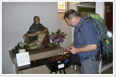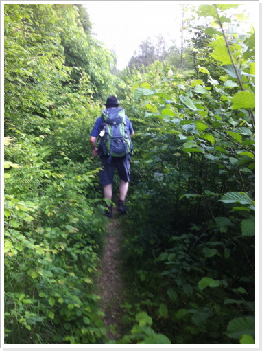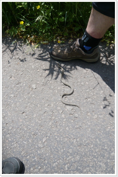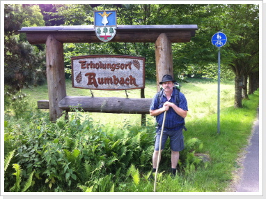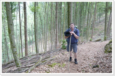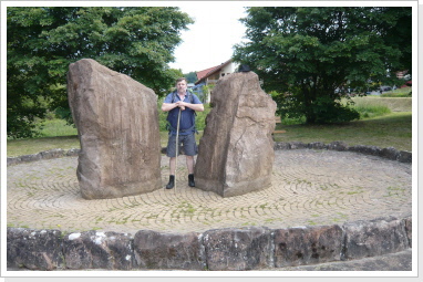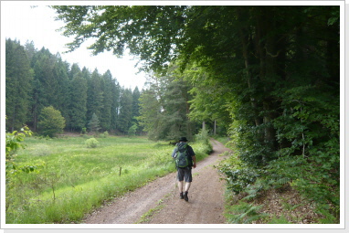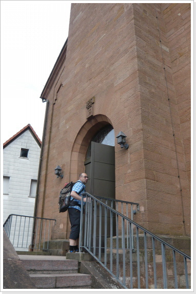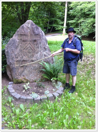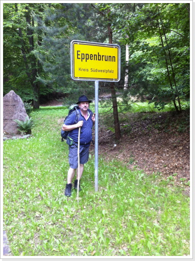 Die vierte und letzte Etappe verlief zuerst von Rumbach nach Heilsbach. Von Heilsbach aus ging es durch den Wald, fast immer dem gleichnamigen Bach entlang über Ludwigswinkel nach Schöntal. Hier wurden wir ein paar Meter von einer kleinen Schlange (siehe Bild) begleitet. Circa 3 km nach Schöntal, haben wir uns dann das erste mal auf der gesamten Tour richtig verlaufen. Laut Karte, sollten wir hier ungefähr die Bundesstraße überqueren, auch die Muschel des Pfälzer Jakobsweges war auf der anderen Straßenseite zu sehen. Der einzige Weg führte uns jedoch immer weiter in Richtung Süden, lag doch unser Etappenziel in östlicher Richtung. Nach ca. 15 Minuten pilgern, war auch keine Muschel mehr zu sehen. Und nicht nur das dieser nicht endende Weg auf einmal steil bergauf ging, nein, es fing auch an wie aus Eimern zu Regnen. Super! Nach ein wenig Querfeldein, und ca. 3 km mehr auf der Uhr, fanden wir zum rechten Weg zurück. Nach längerer Analyse was wir falsch gemacht haben, fanden wir heraus, das wir an der Bundesstraße nur ca. 400 m. der Straße folgen mussten, um am gleichen Punkt anzukommen, an dem wir jetzt standen. Nun, wo das Wetter wieder besser wurde, hatten wir nur noch den Eselsteig, einen steilen Höhenweg vor uns. Den Namen trägt die Steige vom Salztransport, der dort schon zur Römerzeit, wahrscheinlich mittels Eseln, stattfand. In den 60er Jahren war die Eselsteige eine berüchtigte Autorennstrecke, auf der damals das “Wasgau-Bergrennen“ ausgetragen wurde. Leider hatten wir, wie du Jungs darmals heute keine NSU TT’s oder sonstigen fahrbaren Untersatz dabei. Somit mussten wir die Steige zu Fuß bewältigen. Die restlichen 5 – 6 km waren jedoch wieder flach und somit angenehm zu pilgern. Ca. gegen 17.30 hatten wir dann endlich unseren Zielort, Eppenbrunn erreicht.