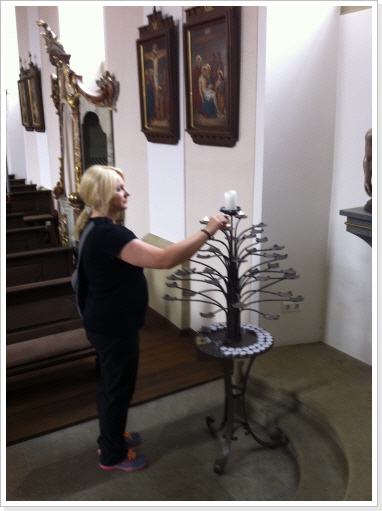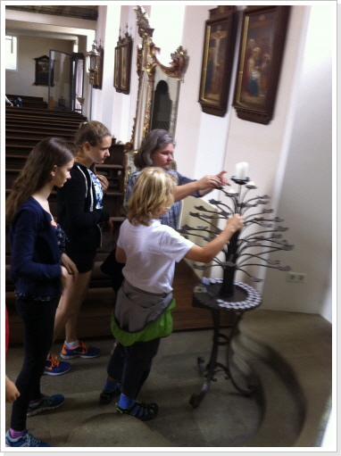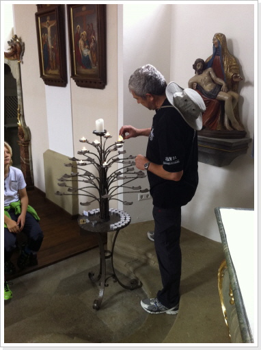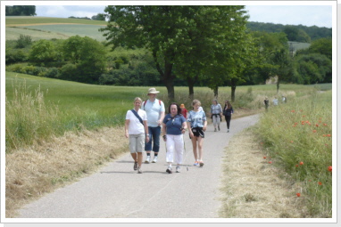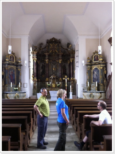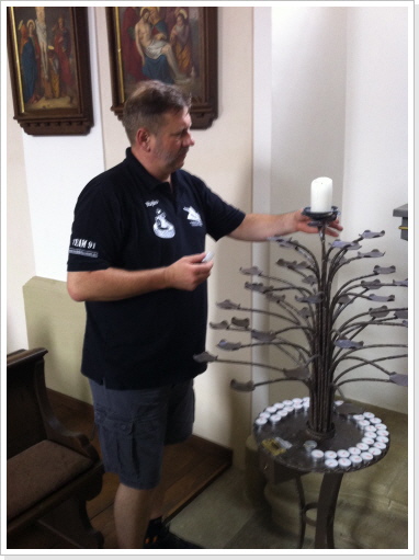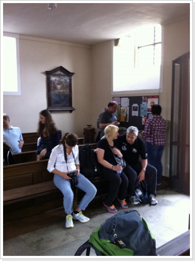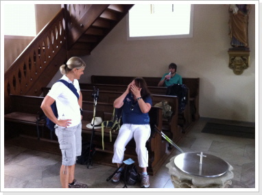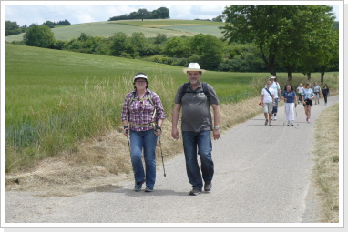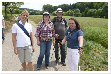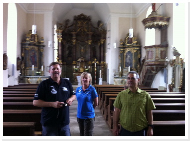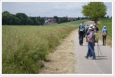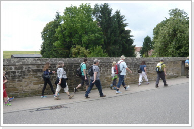 Nachdem wir nun schon fast 300 km immer nur zu zweit gepilgert sind, hat es uns sehr gefreut am heutigen Tag mit einer, von uns ins Leben gerufenen Pilgergruppe, von 19 Pilgern die etwas kürzere Etappe von Babstadt zum Auto & Technik Museum in Sinsheim zu laufen. Auch Michael Weber, Teamchef des Team-Technik-Museum bei der Allgäu Orient Rallye 2013 Weber und seine Partnerin Martina, gaben uns auf dieser Etappe die Ehre, was uns ebenso gefreut hat. Desweiteren pilgerten Mitarbeiter des Museums, viele nette Leute die auf unsere Zeitungsartikel aufmerksam wurden, und Björn mit Familie von der Lebenshilfe die ca. 15 km mit uns. Zu Begin der Tour bekam jeder Pilger, seine Pilger-Grundausstattung, in Form eines Pilgerpasses und einer kleinen Jakobsmuschel für den Rucksack.. Start war auf der Rückseite des Babstadter Bahnhofes, wo uns zuvor der eigens eingerichtete Shuttle Service absetzte. Von dort aus ging es in Richtung Kath. Kirche (leider geschlossen), und danach in Richtung Ortsausgang über die Felder in ein kleines Waldstück. Nach einiger Zeit erreichten wir Grombach, In der St. Margaretha-Kirche, konnte die Pilger ihren ersten heiß ersehnten Stempel in ihre Pilgerpässe stempeln. Nach kurzem Aufenthalt in der Kirche, ging es auch schon weiter in Richtung Schloß Neuhaus. Hier erwarteten, sorry, warteten wir auf Rajko’s Sohn Lucas. Nach ca. 5 Minuten kam dann auch der Museums-Sprinter mit frischen Brezeln, Obst uns kühlen Getränken um die Ecke. Nach dieser ausgiebigen Pause, ging es auf die letzten Kilometer nach Steinsfurt und direkt zum Auto & Technik Museum.